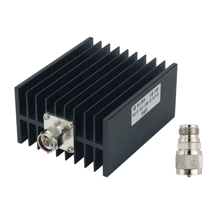 Designed for devices up to 100W continuous power, this dummy load safely converts RF energy to heat during transmitter alignment, service work, and bench testing. The robust N-male connector with adapter ensures compatibility with professional power meters and radio equipment. With SWR ≤1.25 and compact aluminum construction (120×100×60mm, 700g), it's suitable for both lab and field use.